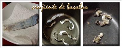 Ya sólo nos queda hacer el acompañamiento del salmorejo para este plato en particular y no será otro que un crujiente de bacalao, para ello, la piel del bacalao que reservamos al principio la secamos un poco con papel de cocina. La cortamos en finas tiras y las ponemos en una sartén o cazo a fuego fuerte sin nada de aceite. Con esto conseguiremos que la piel se nos encoja y se ponga crujiente crujiente con un sabor a bacalao intenso que le dará un gran toque a este acompañamiento.