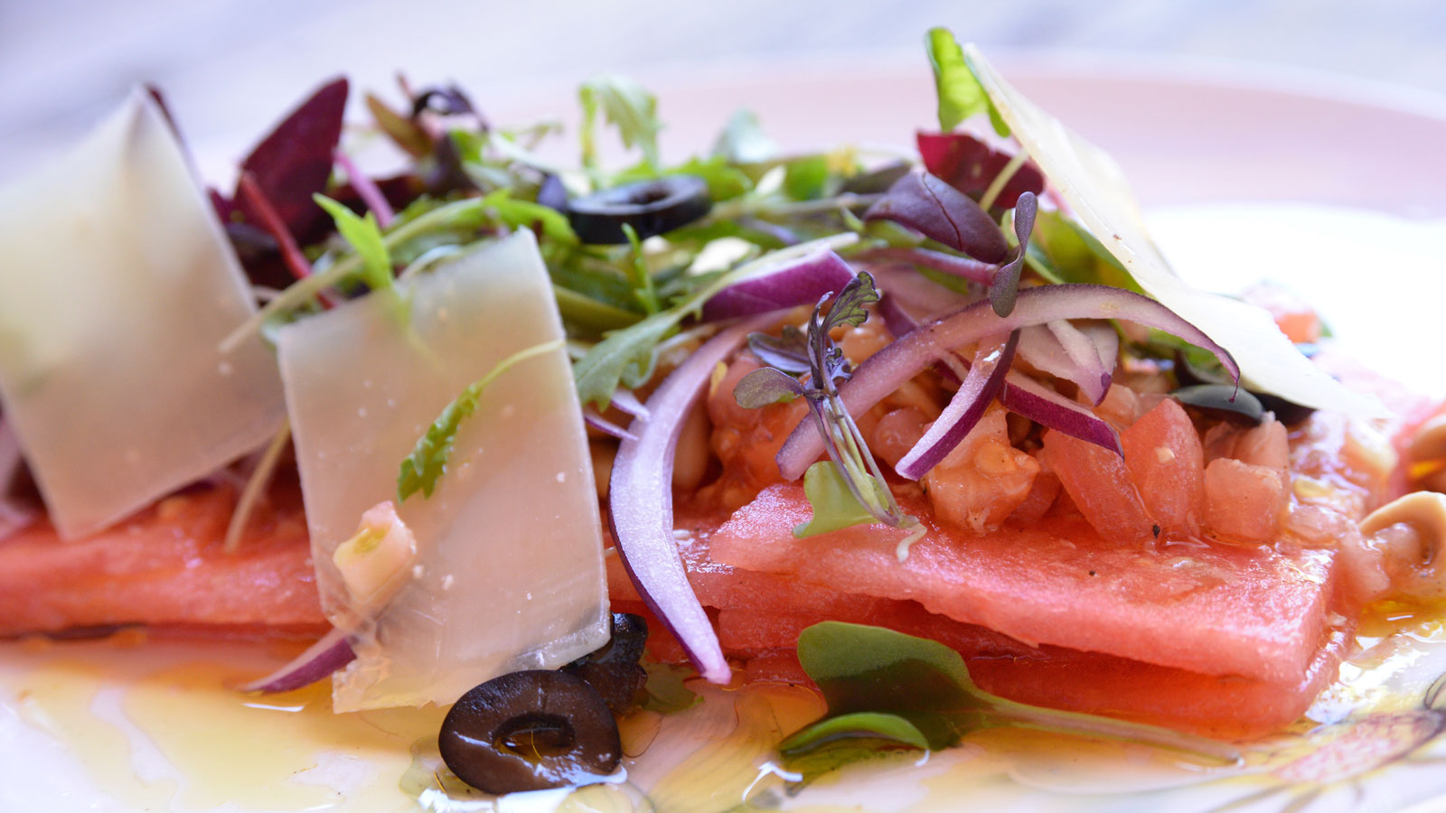 Mojamos con esta vinagreta la sandía y colocamos 100 g de mezclum de hojas tiernas, un puñado de aceitunas negras y una cebolleta roja cortada en láminas.