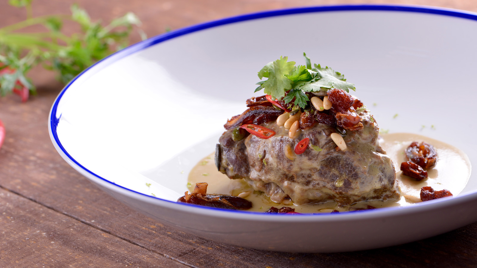 Servimos las carrilleras y acompañamos con los frutos secos, un poco de guindilla, la ralladura de lima y el cilantro.