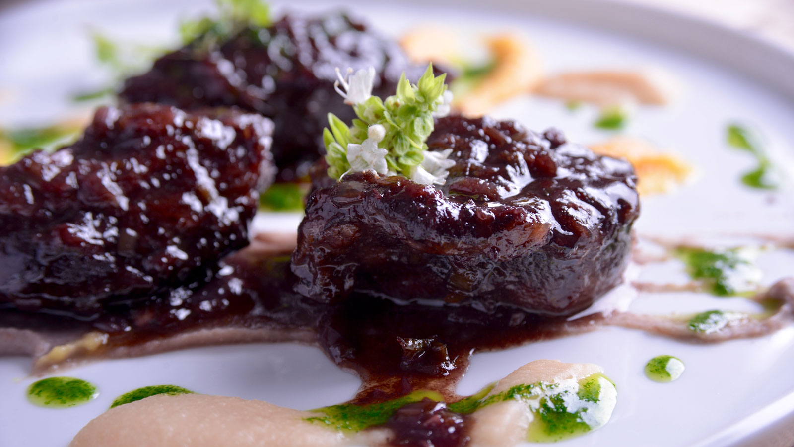 Emplatamos poniendo un poco de cada puré extendido en la base del plato. En el medio colocamos dos carrilleras y mojamos con un poco de aceite de albahaca.