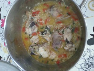 En un perol o cacerola mediano pochar cebolla y pimiento, añadir la necora y partir en dos dentro de la olla, añadir el higado del rape si se tiene, dorar y sacar. Añadir el vaso de arroz refreir 1 u 2 minutos y cubrir bien de agua, echamos sal al gusto y cilantro sin picar. Cuando reduzca un poco añadir de nuevo el higado del rape y el rape troceado, volver a cubir con agua y dejar hervir hasta que el arroz este al gusto y el rape listo para comer. A falta de 5 minutos echar cilantro picado al gusto.