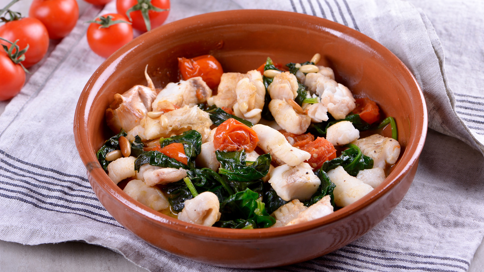 Doramos en esa misma cazuela un par de dientes de ajo con camisa. Añadimos los tomatitos cortados por la mitad, las espinacas y salpimentamos. Salteamos bien y devolvemos a la sartén el pescado y los piñones.