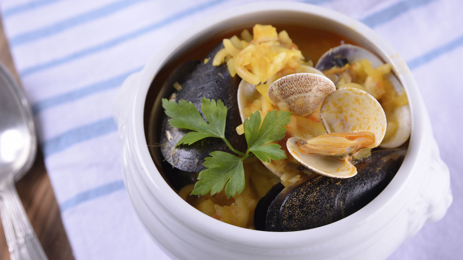 En el último momento añadimos los mariscos y cocinamos con la olla tapada hasta que estén abiertos.