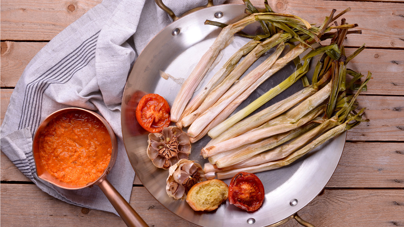 En el capítulo 66 del programa de televisión Sabor de Hogar T3, Juan Pozuelo prepara la receta de Cebolletas tiernas con romescu.