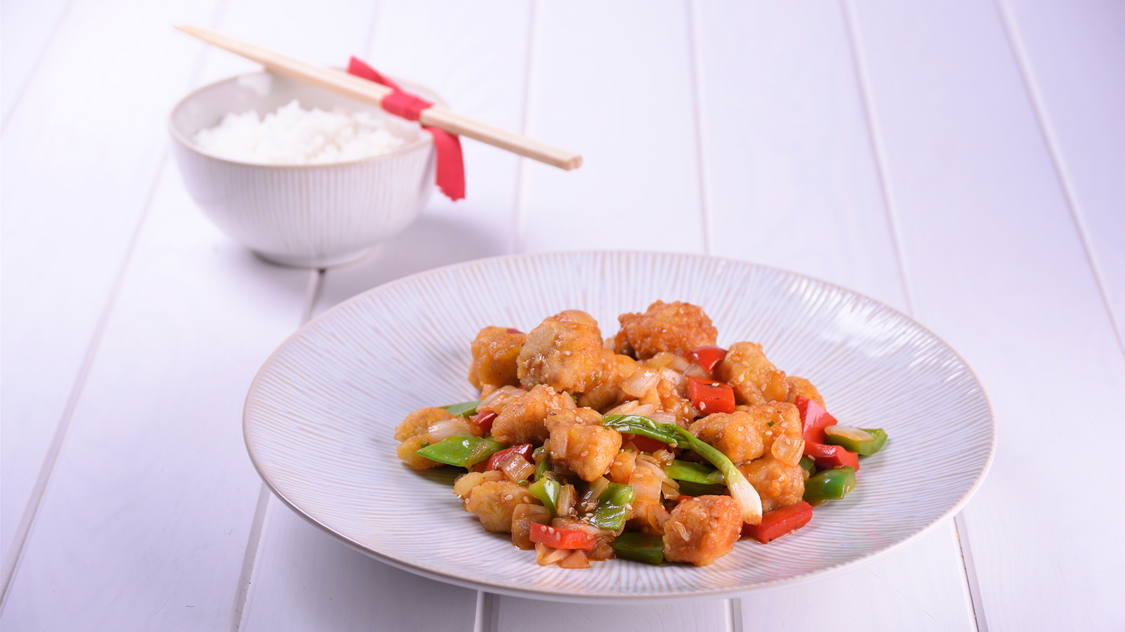Cortamos la cebolla, el pimiento verde y el pimiento rojo en trozos del tamaño del cerdo y los salteamos en una sartén o wok.