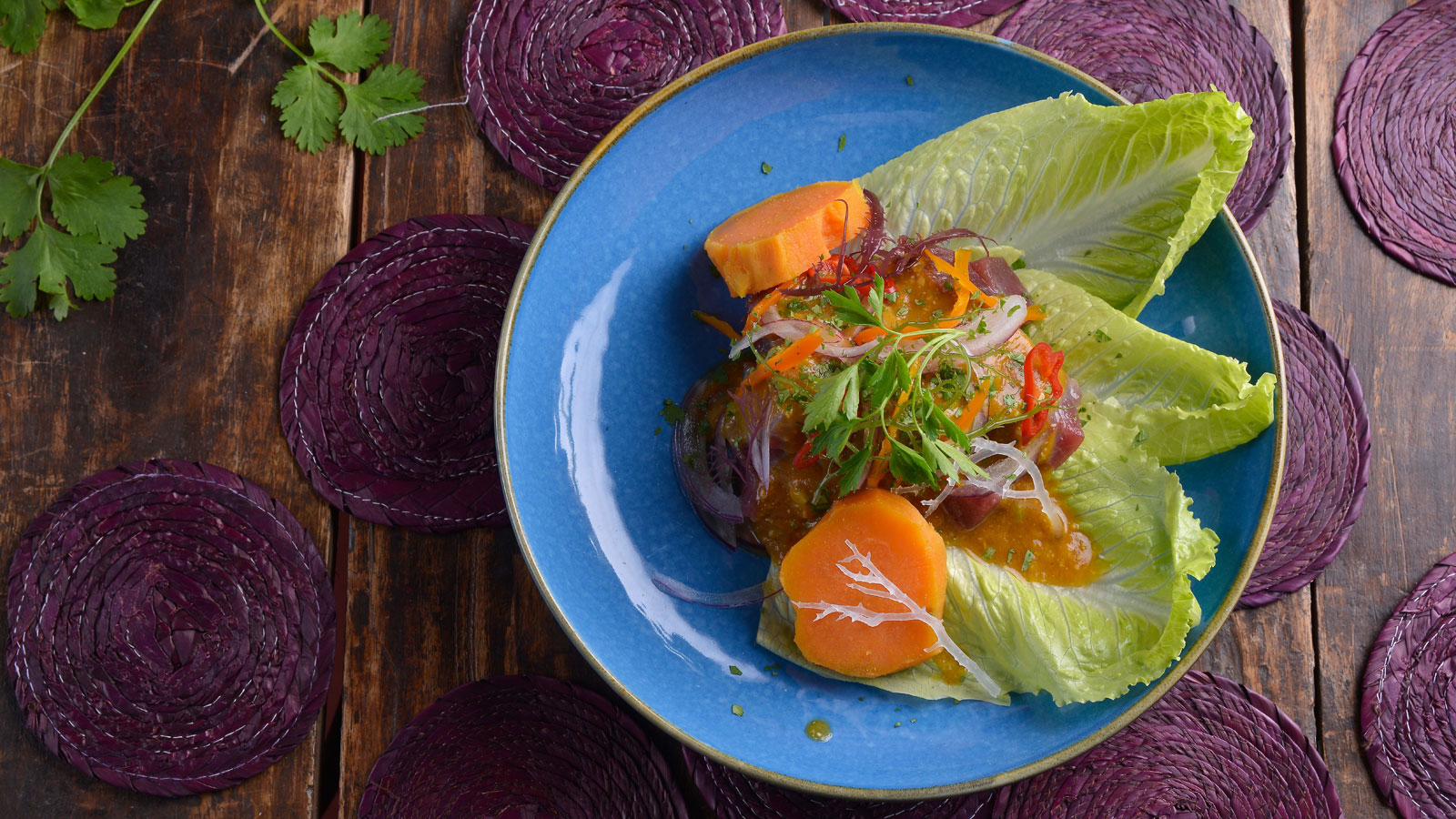 En un plato hondo colocamos hojas de lechuga romana fresca, colocamos encima los cubitos de atún y bañamos con la salsa. Decoramos con la cebolla morada, el cilantro y un poco de ají limo.