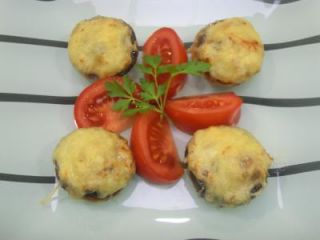 Rellenar los champis e ir colocando en una fuente para horno, cuando estén todos rellenos (llenarlos bien),