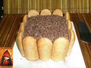 Metemos la tarta a la nevera durante al menos 4 horas para que coja cuerpo. Pasado este tiempo, la sacamos, retiramos el molde y ponemos alrededor los bizcochos de soletilla cortados todos del mismo tamaño. Decoramos con cacao en polvo y fideos de chocolate.