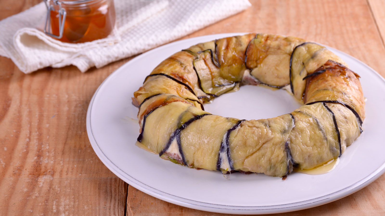 Charlota de pato, berenjena y miel