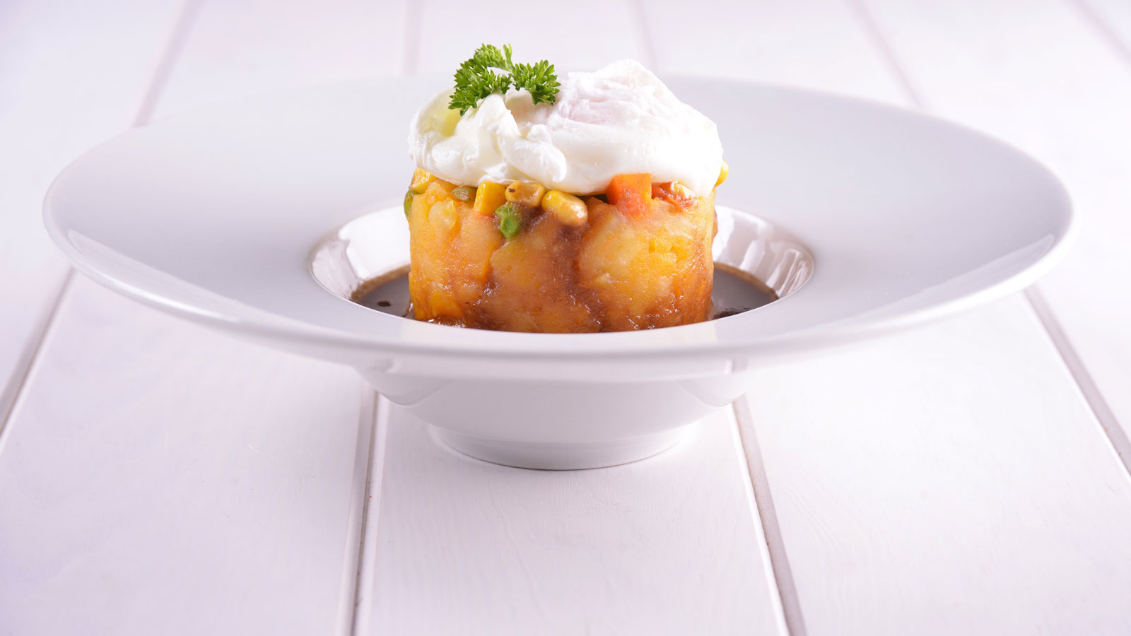 Emplatamos el charquicán en un aro y terminamos con el huevo.