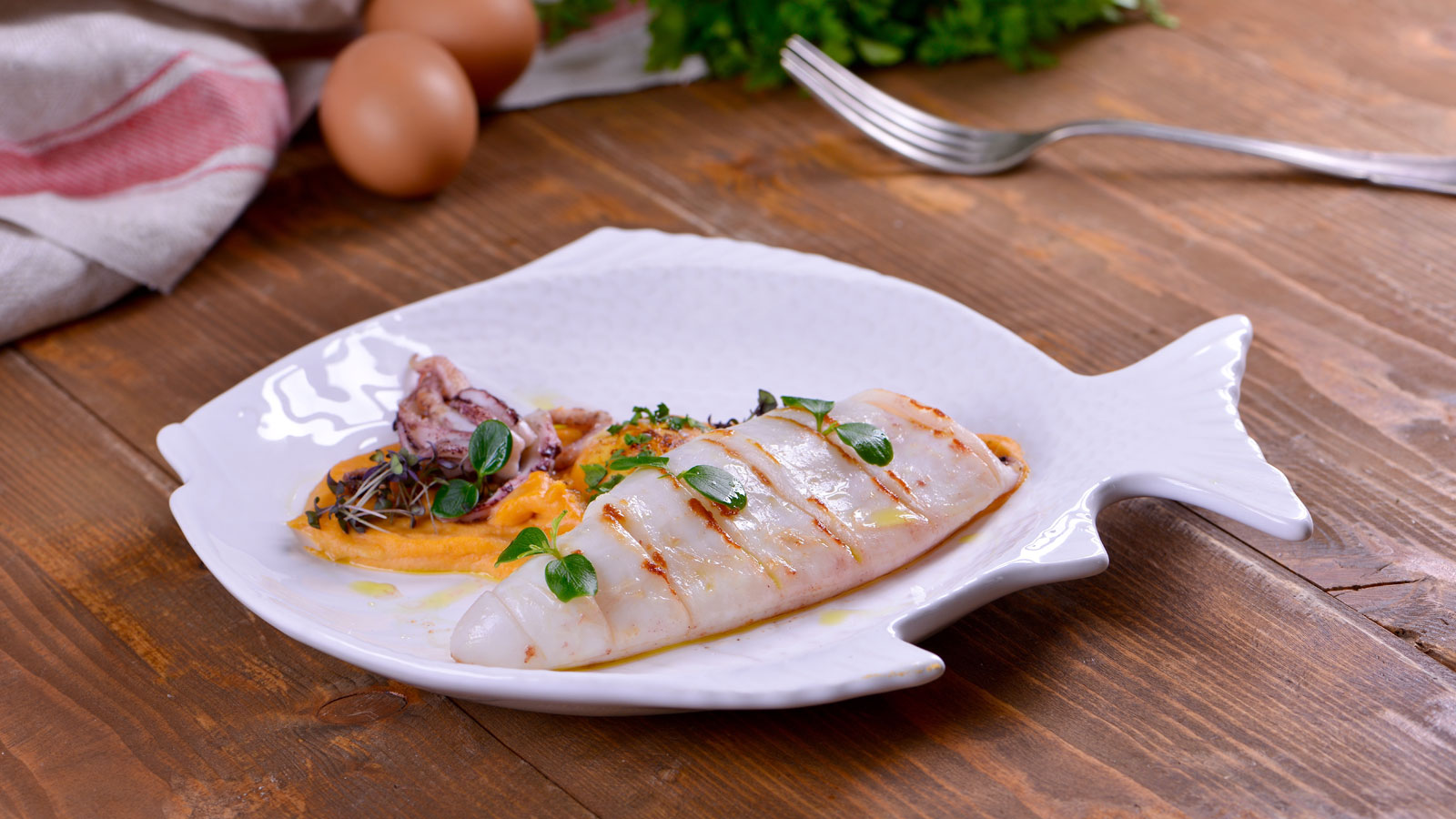 Chipirones a la plancha con yema de huevo y crema de alubias blancas
