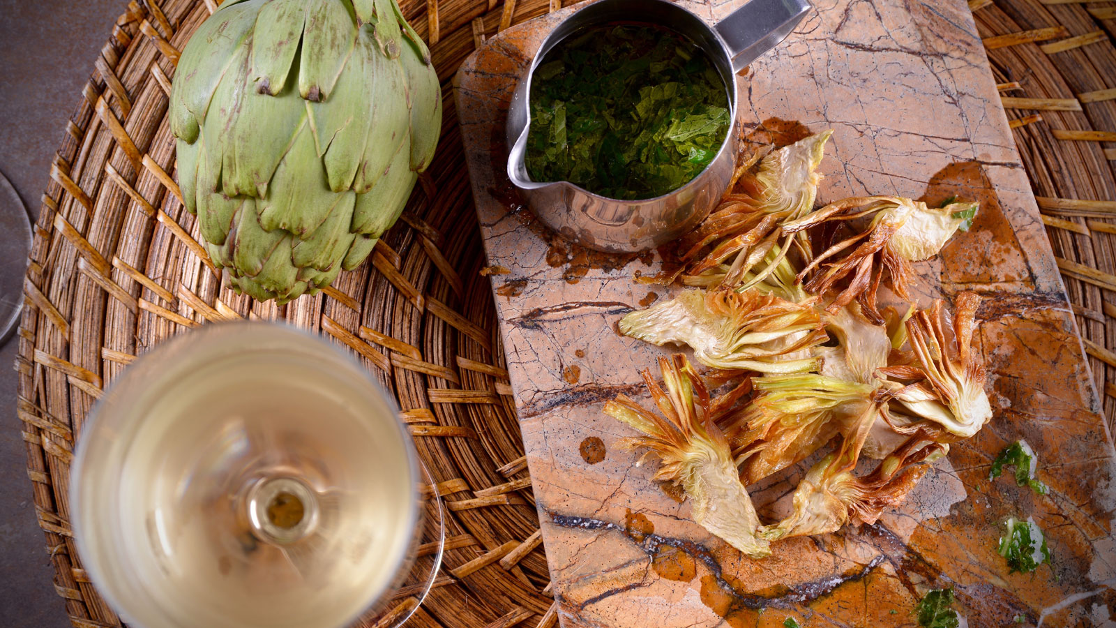 Emplatamos las chips de alcachofas. Aliñamos las chips con la vinagreta de menta y limón.