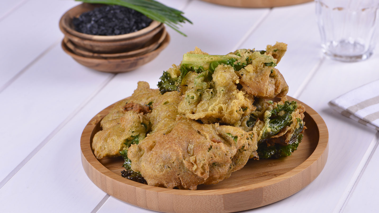 Embadurnamos un manojo de kale lavado y troceado en nuestra tempura y lo freímos en abundante aceite de oliva virgen extra caliente en una sartén.