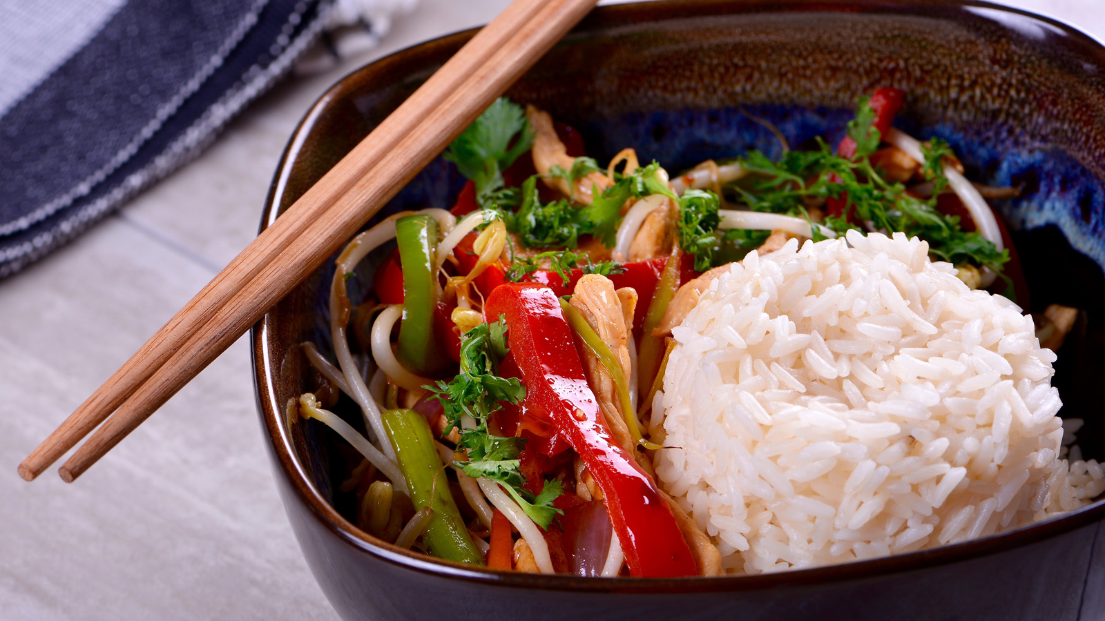 Añadir los brotes de soja, la cebolleta china y servir junto al arroz.