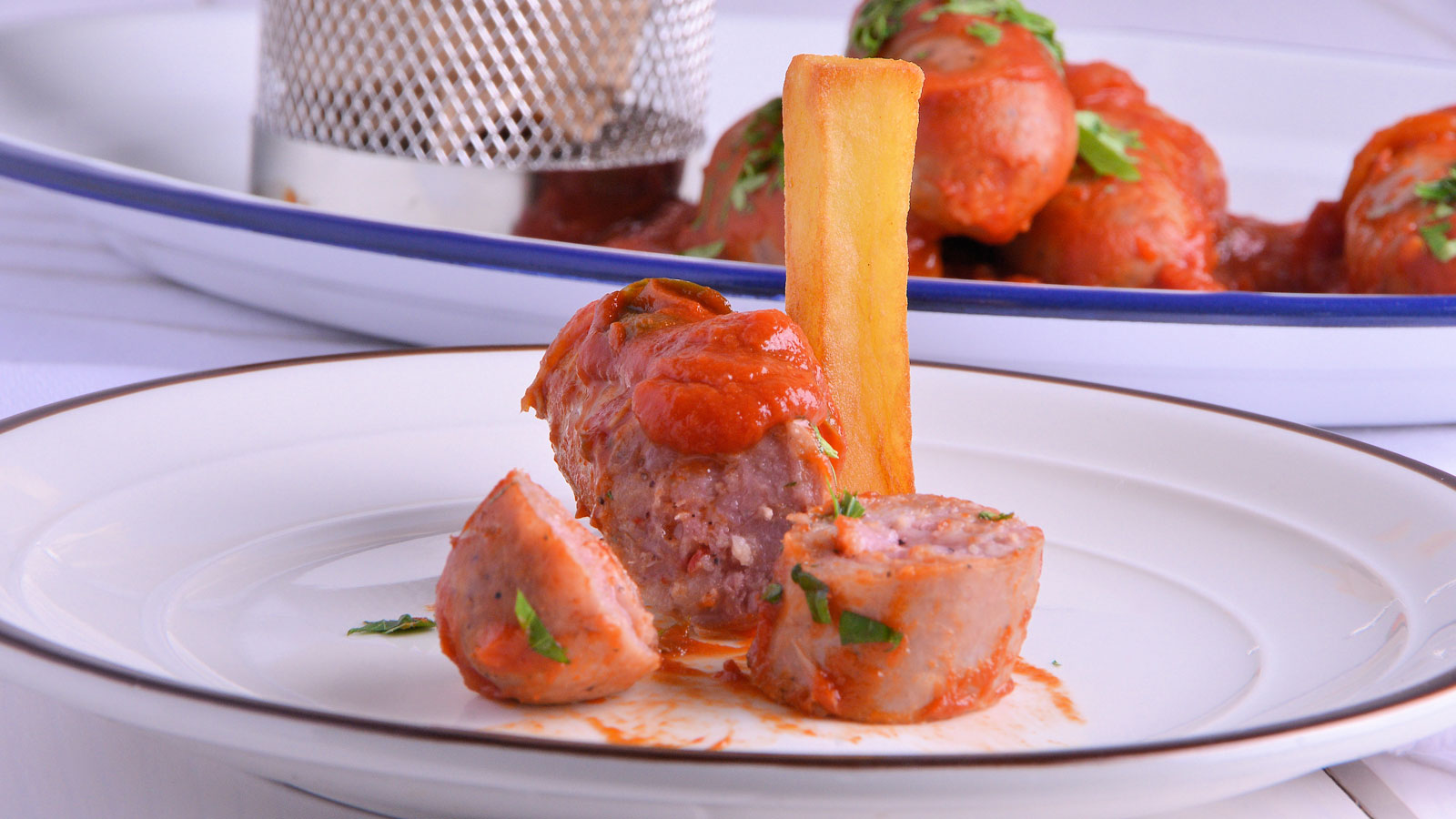 Emplatamos los chorizos en una fuente decoramos con más perejil picado y lo acompañamos con patatas fritas.