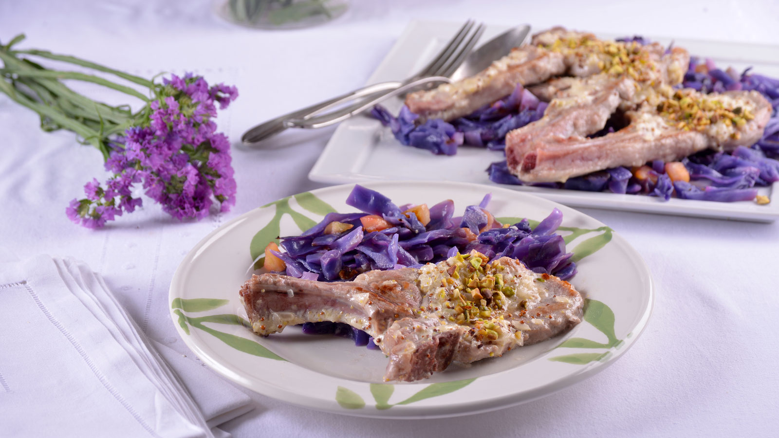 Chuletas de cerdo con mostaza antigua, pistacho y lombarda