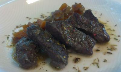 He presentado el plato haciendo un puré con una parte de las verduras, poniendo sobre él la carne y añadiendo unas verduritas a un lado y un poquito de salsa alrededor. He terminado aderezando con un poquito más de tomillo en la salsa y pimienta encima de la carne.