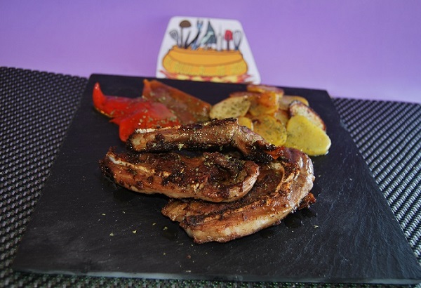 •Se sirven las chuletas calientes, acompañadas de patatas y pimientos asados.