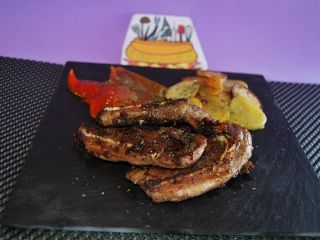 •Se sirven las chuletas calientes, acompañadas de patatas y pimientos asados.