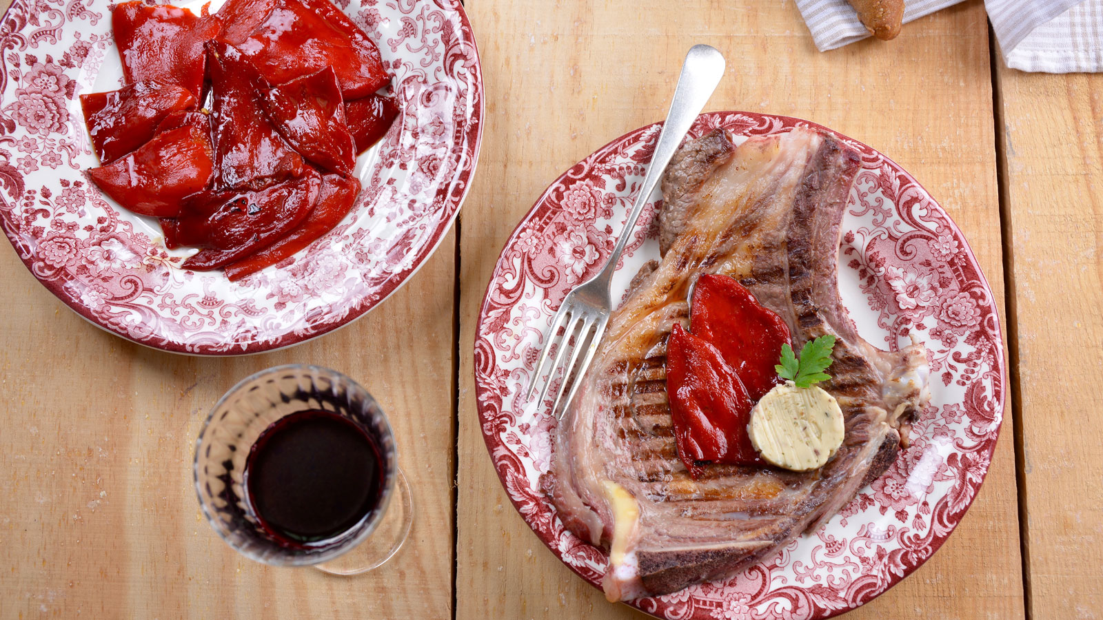 Chuletón con piquillos caramelizados y mantequilla de anchoa