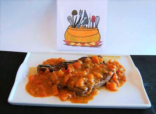 Mientras, habremos mezclado en un bol o salsera, todos los ingredientes para la mantequilla al Bloody Mary (yo derretí un poco la mantequilla para facilitar la elaboración de la salsa) y con la ayuda de una cuchara, distribuiremos sobre los trozos de churrasco antes de servirlos.
