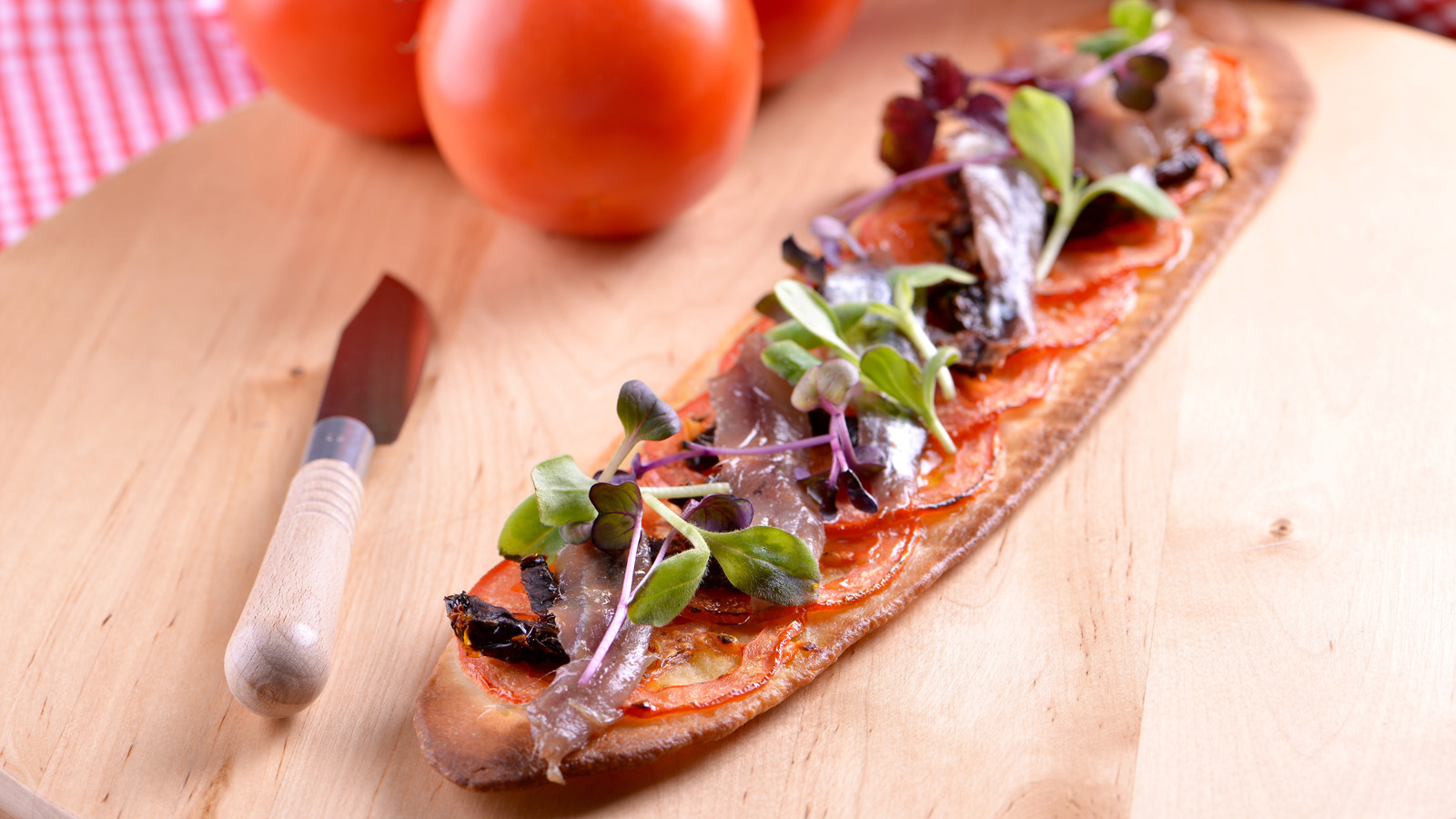 En el capítulo 626 del programa de televisión Cocinamos contigo T4, Sergio Fernández prepara la receta de Coca de tomate con sardinas.