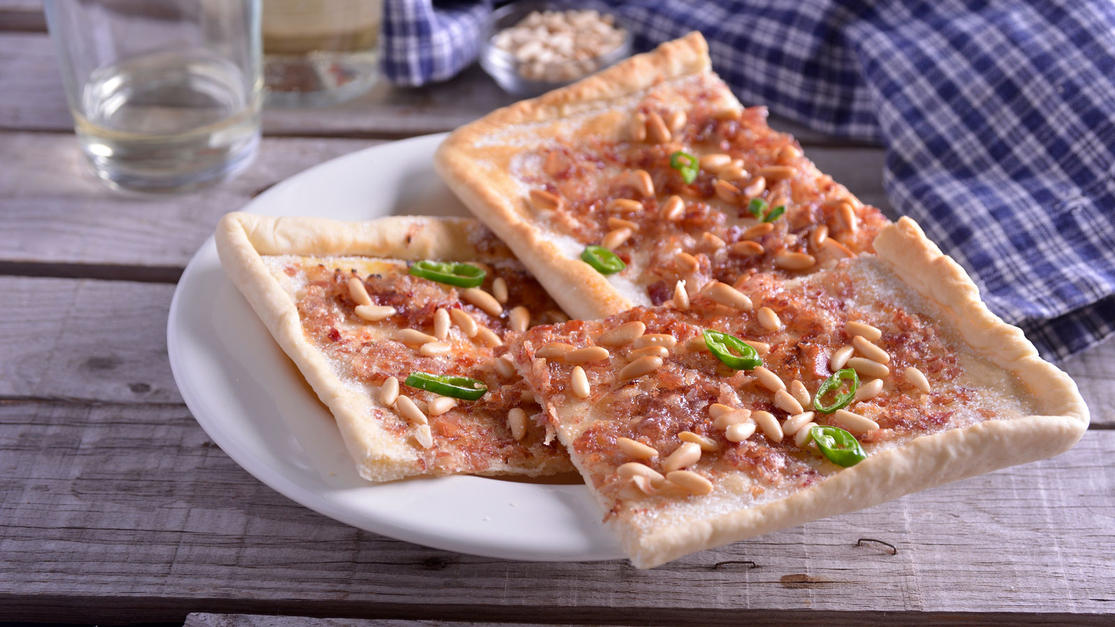 Sobre la masa distribuimos los chicharrones, los piñones y espolvoreamos con abundante azúcar.