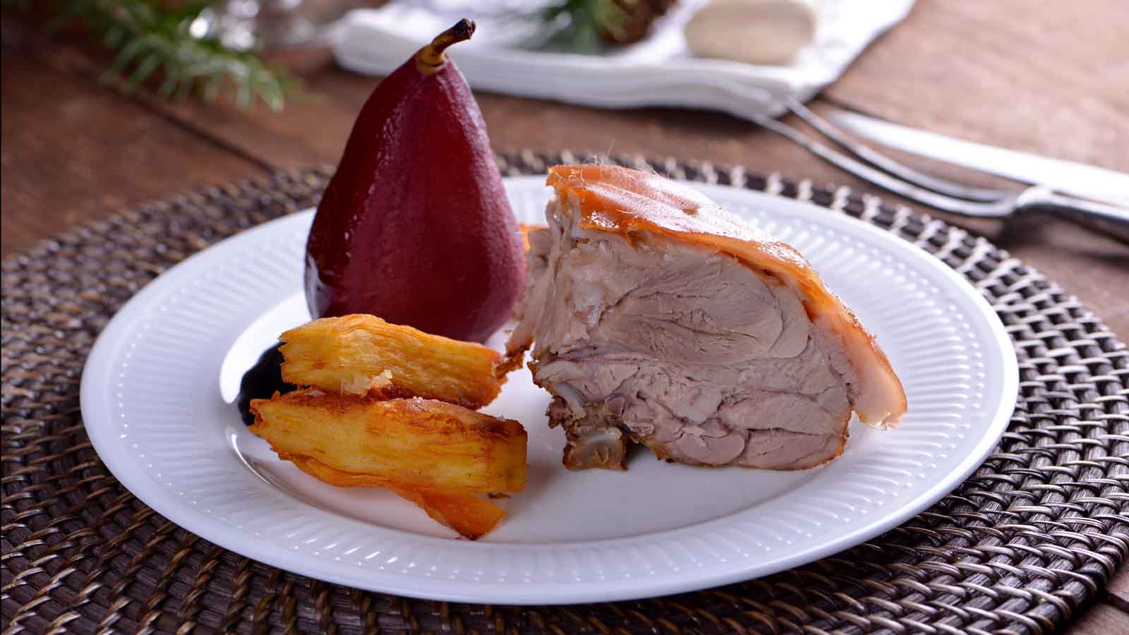 Servimos el cochinillo y acompañamos con las peras cortadas en cuartos, un poco de la reducción del vino y una rama de romero.