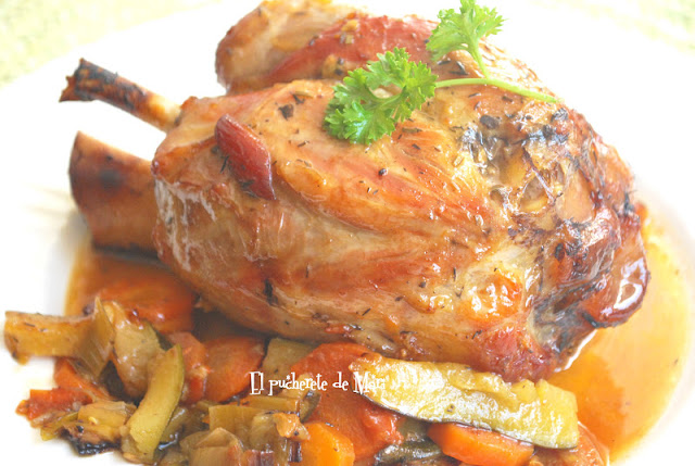 Añadiremos un cucharon, de los de servir la sopa, de liquido del adobo y dejaremos que se vayan cocinando a unos 170º durante una hora y media, dando la vuelta a los codillos y a la verdura de vez en cuando, también añadiendo caldo del adobo cuando veamos que no tiene, esto es muy importante, porque en este caldo están todos los aromas de las hierbas y el azafrán, también porque de esta forma conseguiremos una carne muy blanda, que se deshaga en la boca.
