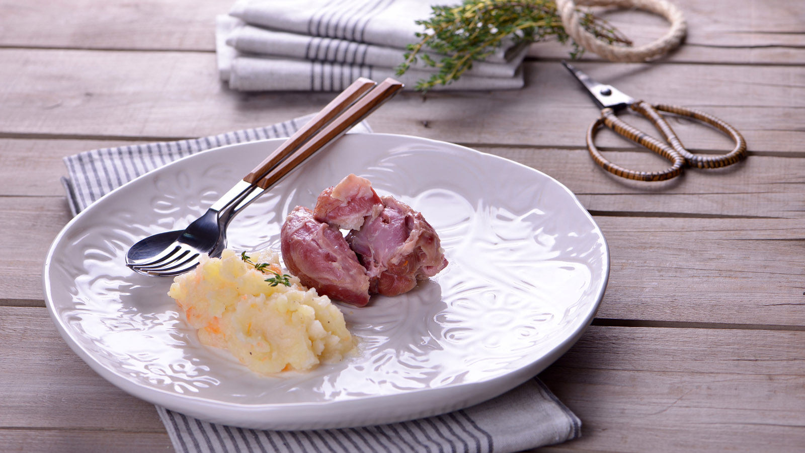 Codillo con puré de raíces (Fläsklägg med rotmos)