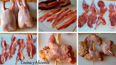 •Las extendemos, las salamos y las pimentamos, colocamos encima la loncha de tocino y enrollamos. Bridamos.