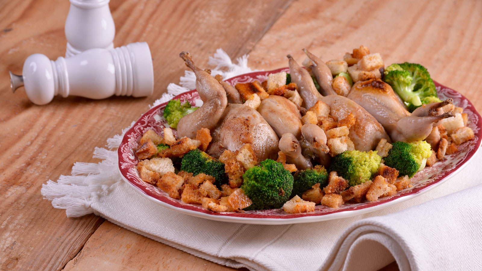 Trinchamos las codornices y servimos con el brócoli regado de la salsa y el pan frito.