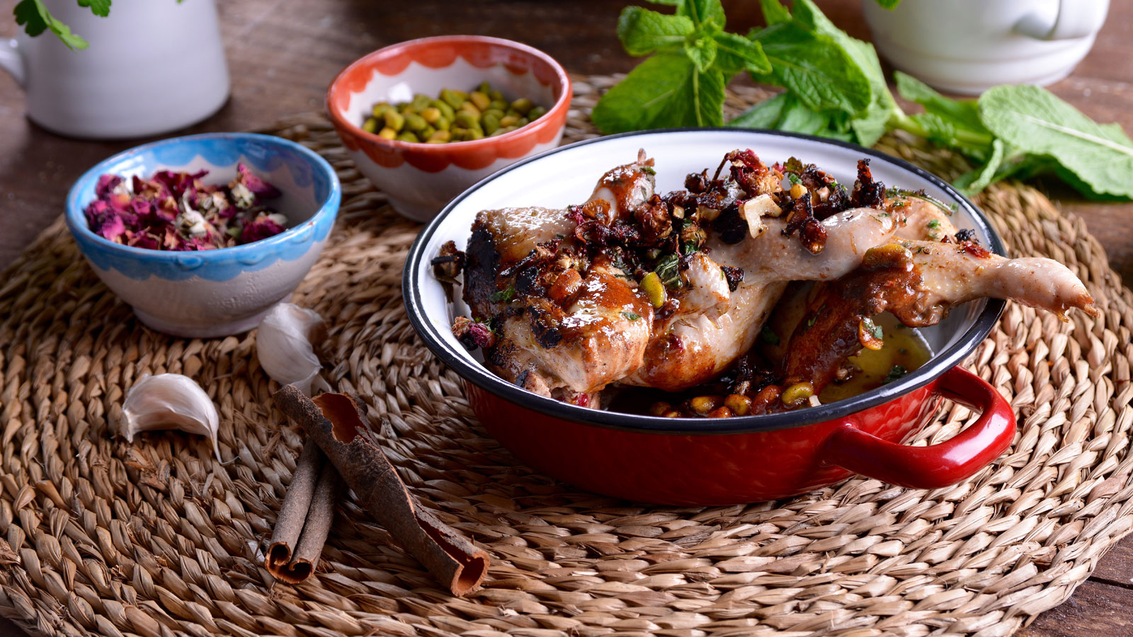 En el capítulo 16 del programa de televisión Cocina marroquí, la cocinera Najat Kaanache prepara una receta de Codorniz a la plancha con salsa de rosas (Hamama Al'Meshwi).