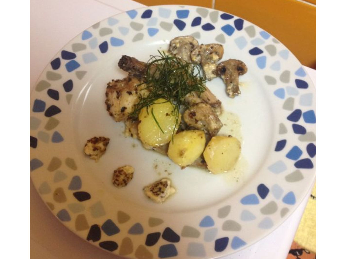 Cortar las patatas y los champiñones por la mitad, y colocarlos en la placa de horno. Hornear.
