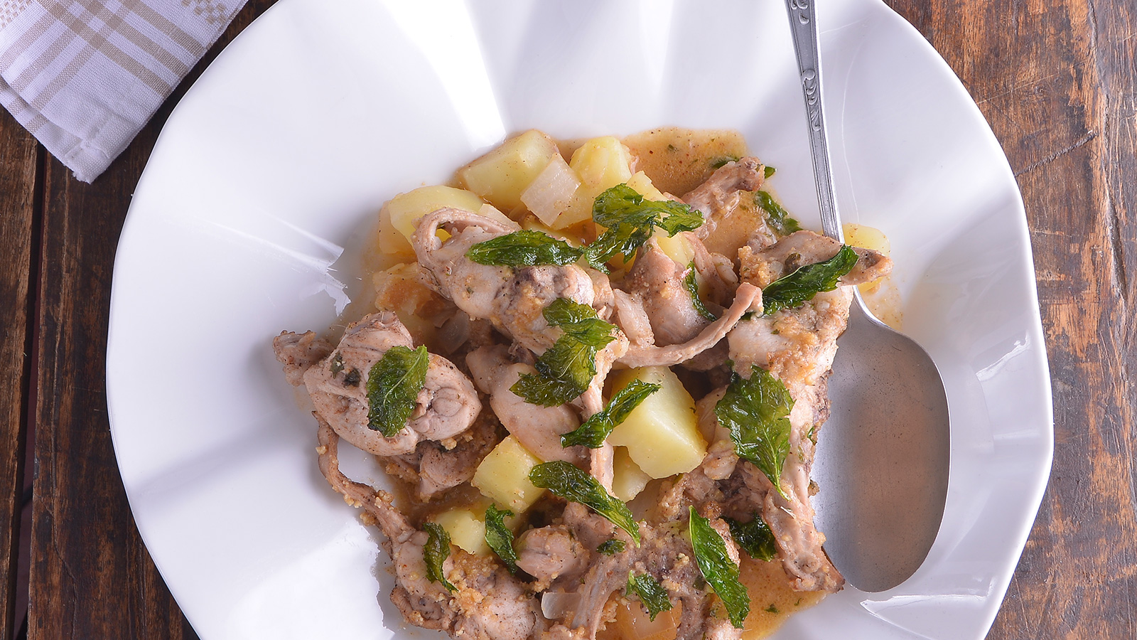 En primer lugar, maceramos el conejo la noche de la víspera con una cucharada de ajo, la sal, la pimienta, el comino, el vinagre y la hierbabuena.