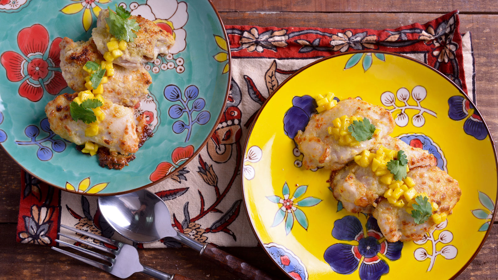 Retiramos la bandeja del horno y emplatamos distribuyendo unas cucharadas del mango troceado por encima. Coronamos con unas hojitas de cilantro fresco.