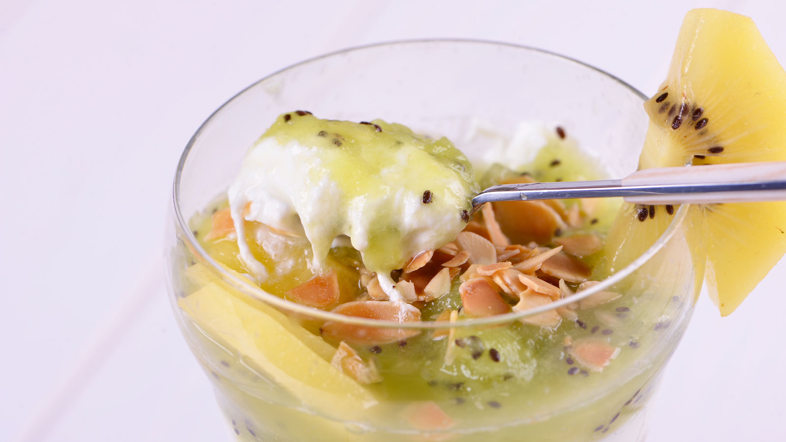 En el capítulo 412 del programa de televisión Los 22 minutos de Julius T2, nuestro cocinero Julius prepara la receta de Copa de burrata y kiwi.