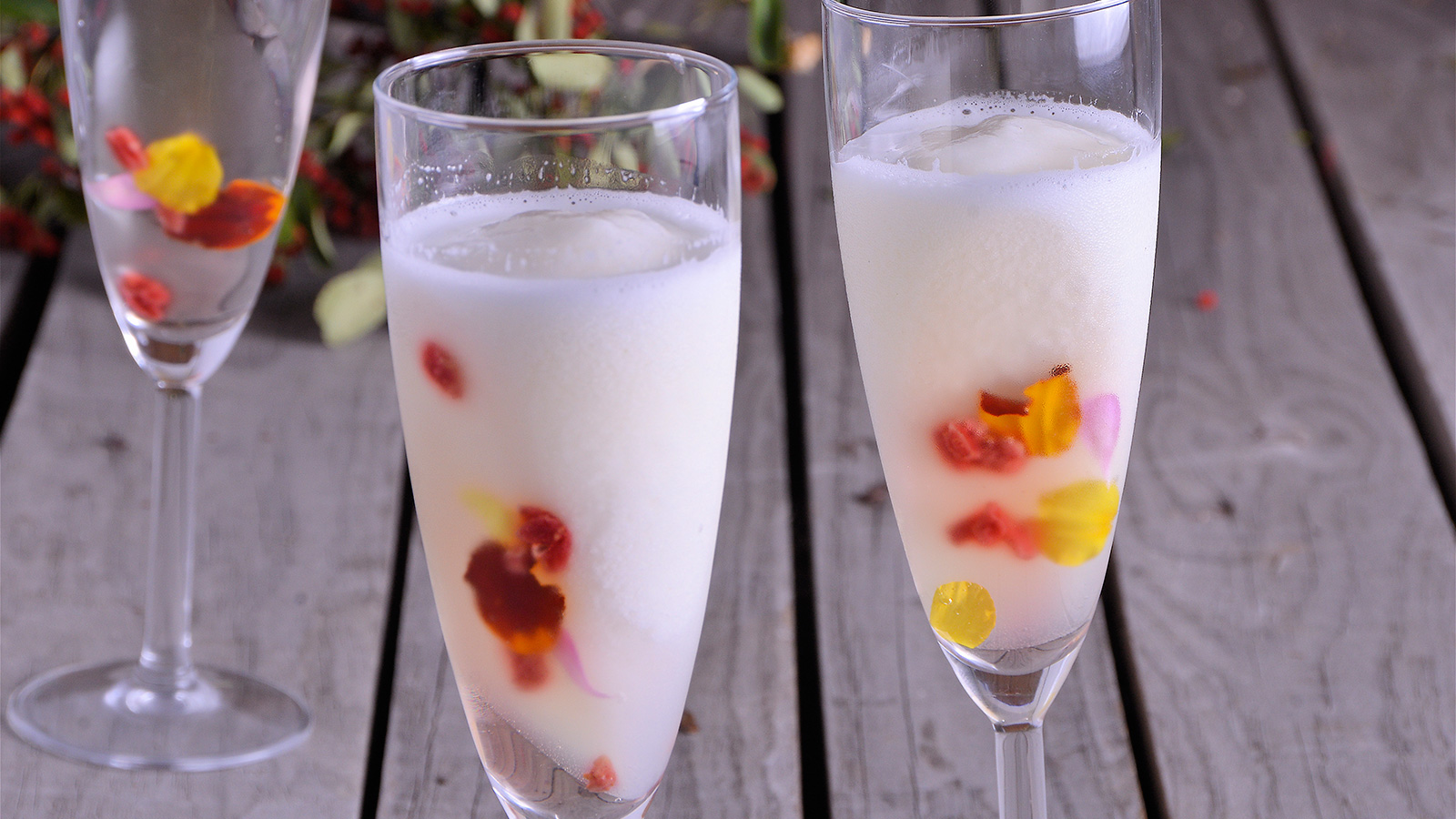 Después colocamos nuestras copas de cava en una bandeja de manera que queden inclinadas para que cuando la gelatina solidifique quede en un lado de la copa. Añadimos encima los pétalos de flor y los frutos rojos y dejamos enfriar durante una hora o hasta que cuaje.