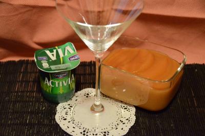 Para ello echamos el contenido de un yoghourt activia de DANONE en una copa de cocktail, por encima unas hojas de menta recién picadas (no se ven, es la sorpresa para los comensales) y luego el dulce de membrillo que tenemos recien hecho.