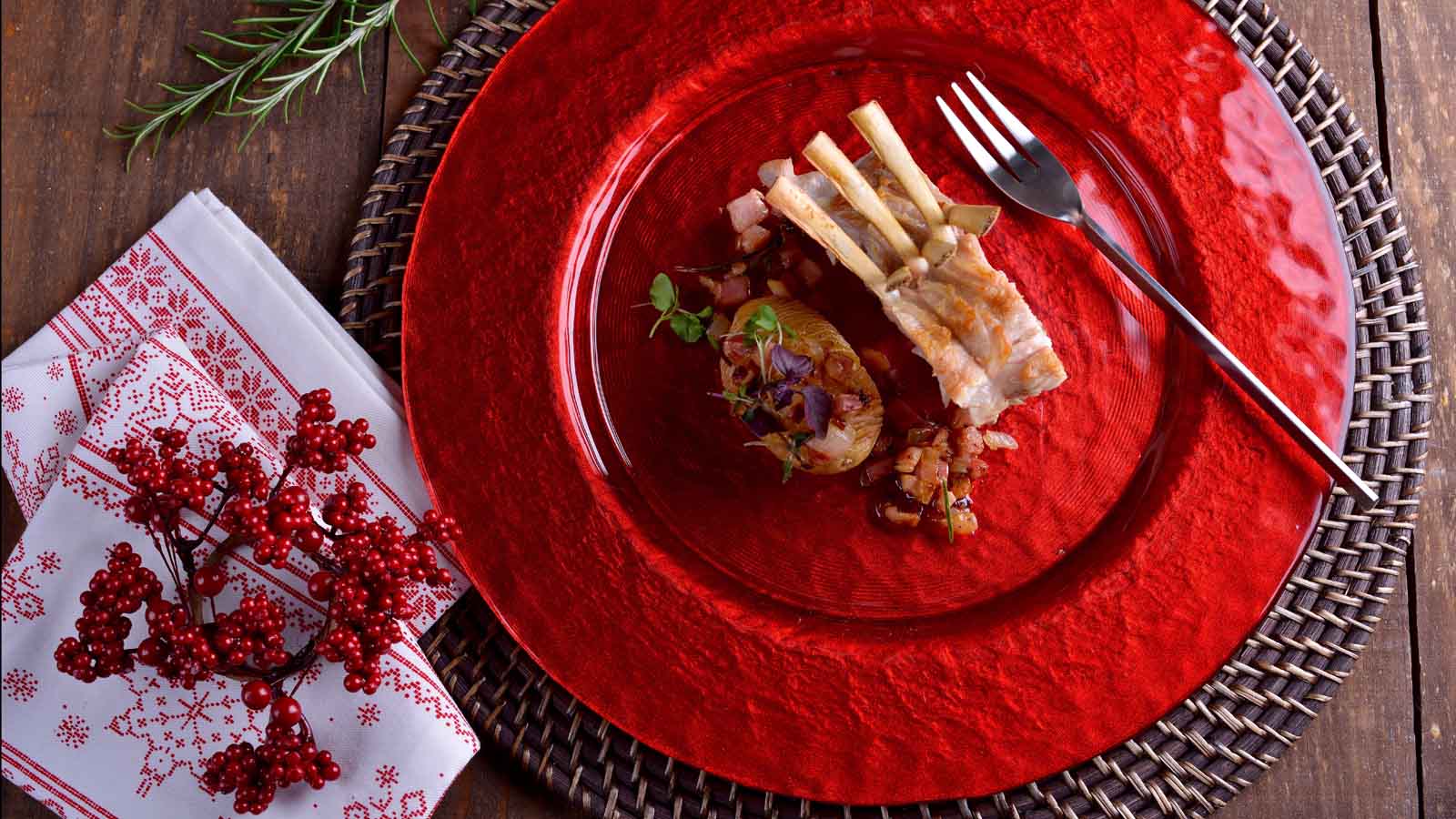 Servimos las costillas de cordero y acompañamos con las patatas y su guarnición de cebolla y beicon.