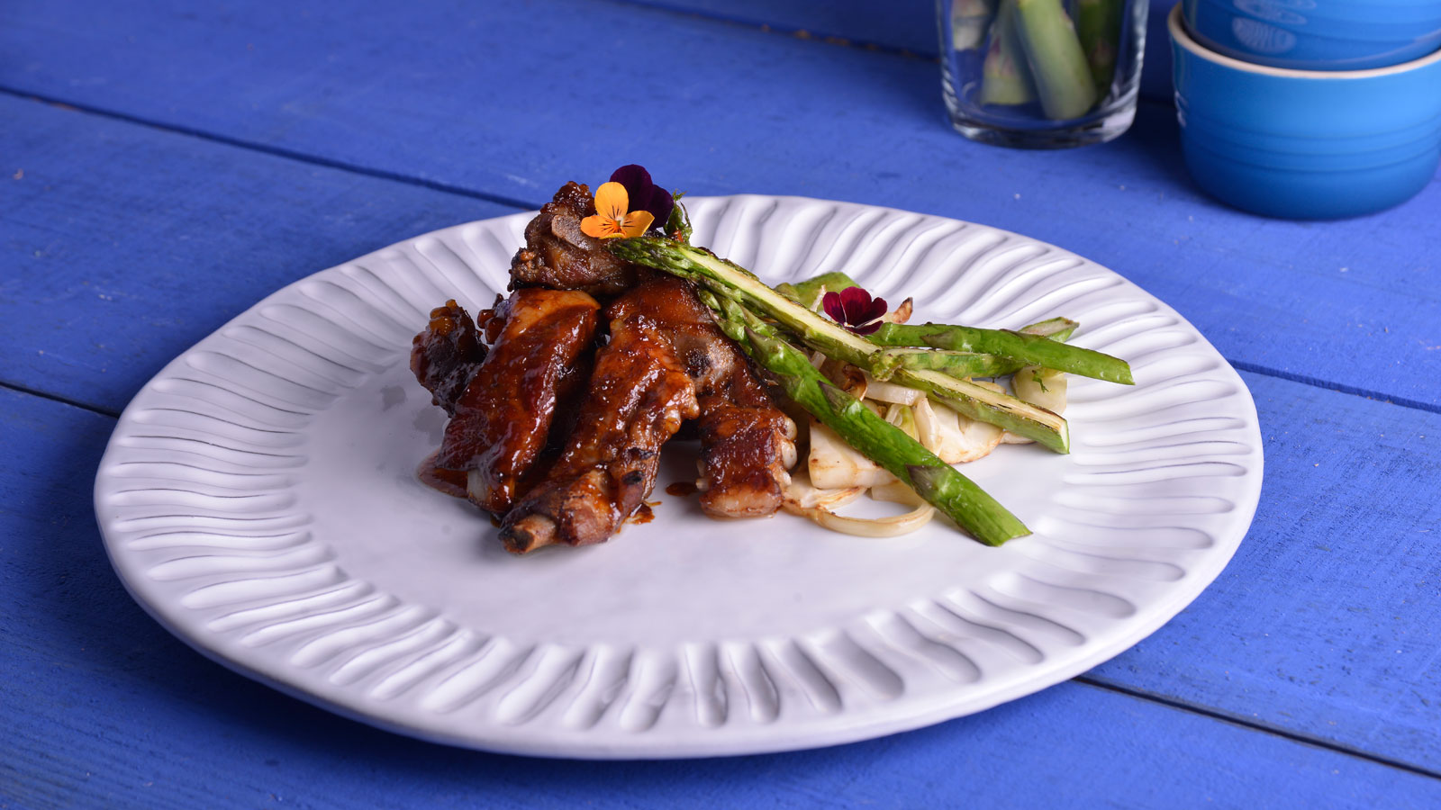 Cuando las costillas hayan dorado, las retiramos del horno y las pasamos a un plato. Las acompañamos con la guarnición de espárragos e hinojo. Terminamos con unas flores de pensamiento.