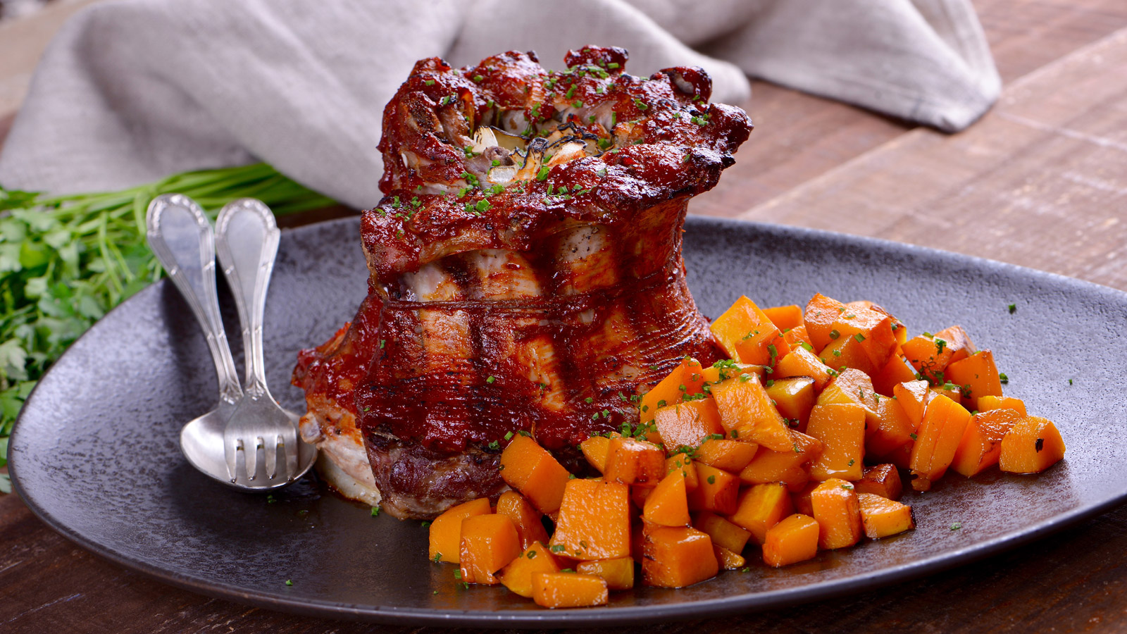 Servimos el costillar con la calabaza y espolvoreamos con un poco de cebollino picado.