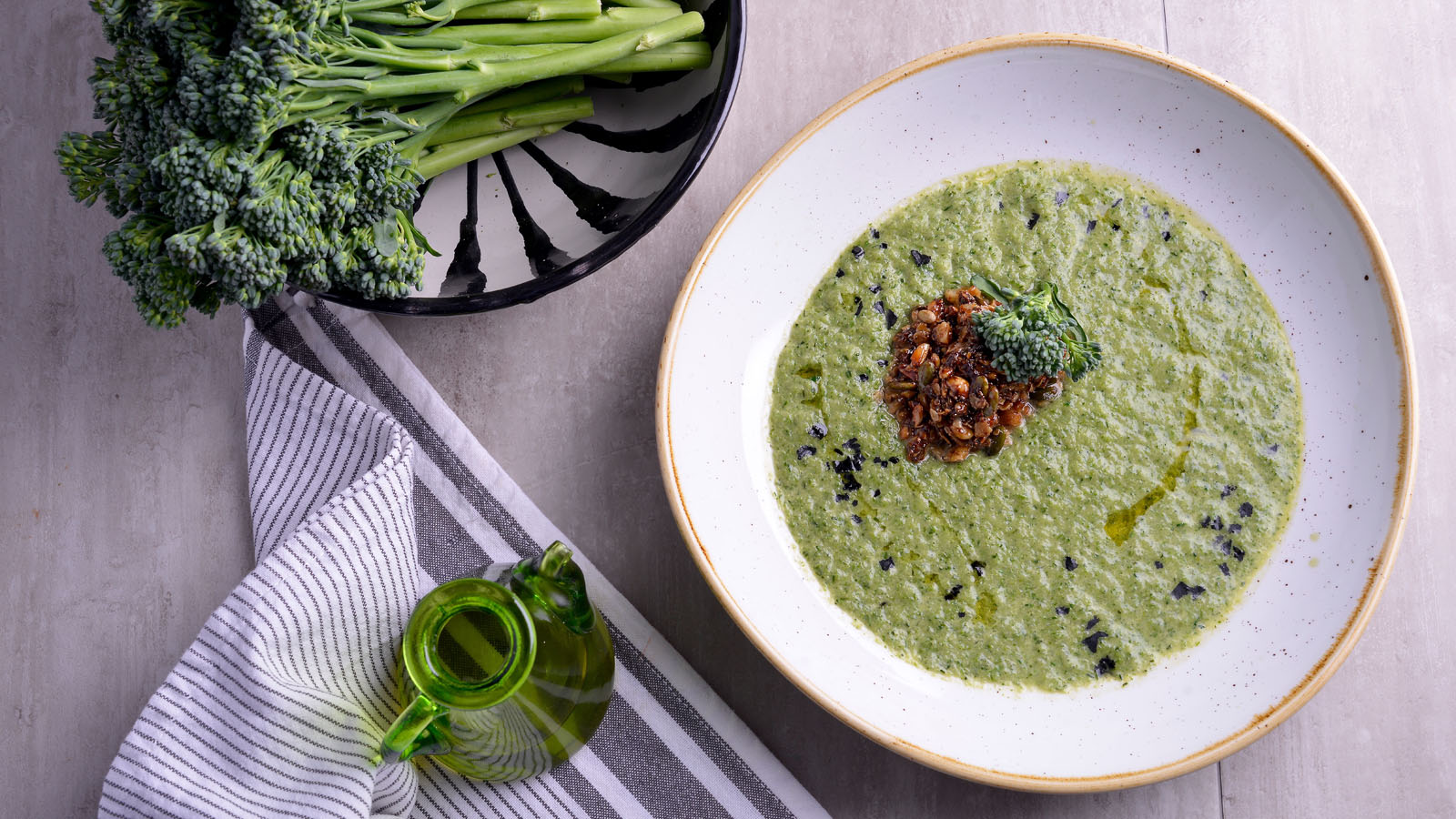 Crema de bimi con granola salada