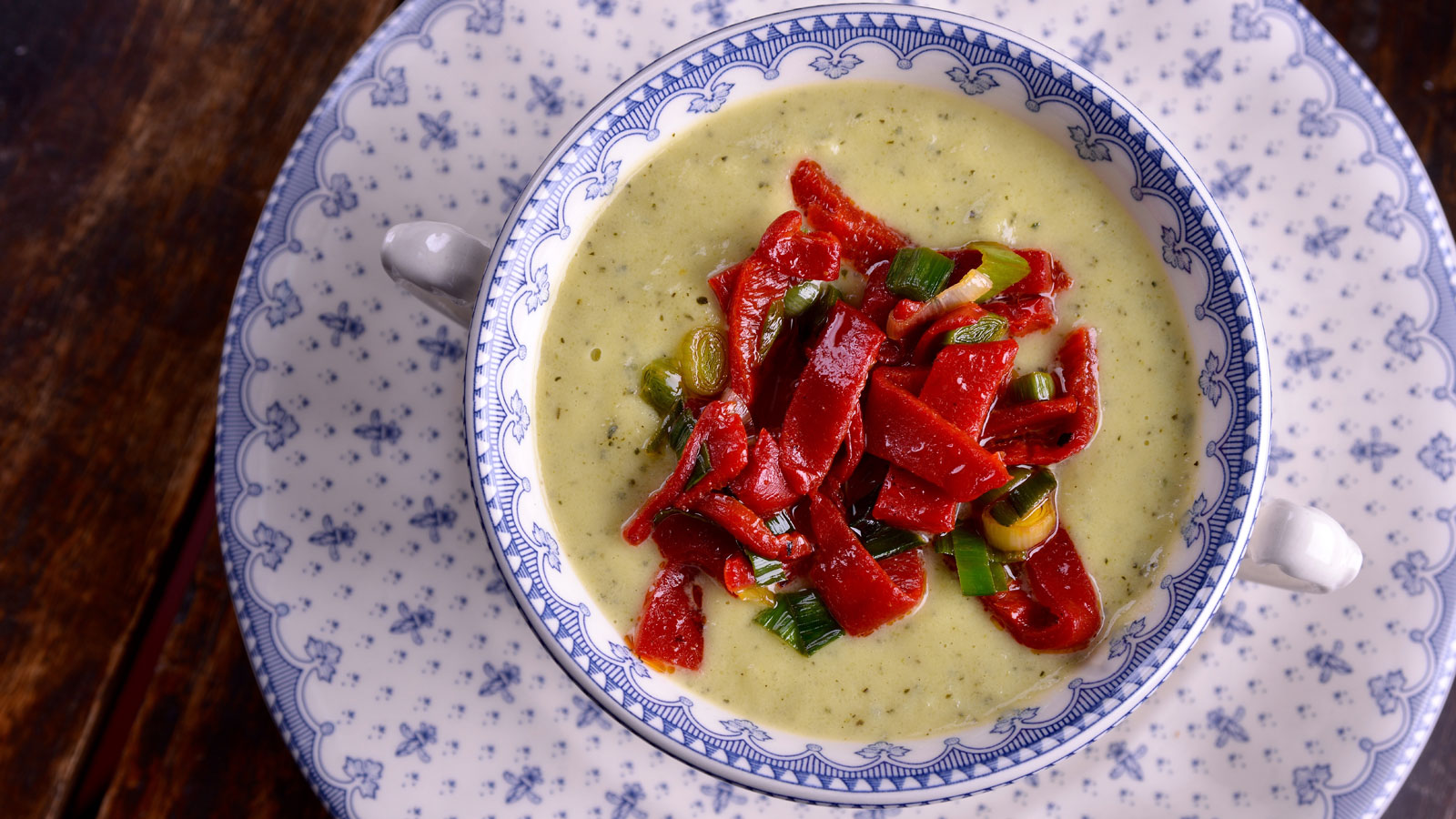 Servimos nuestra crema de calabacín decorada con los pimientos salteados.
