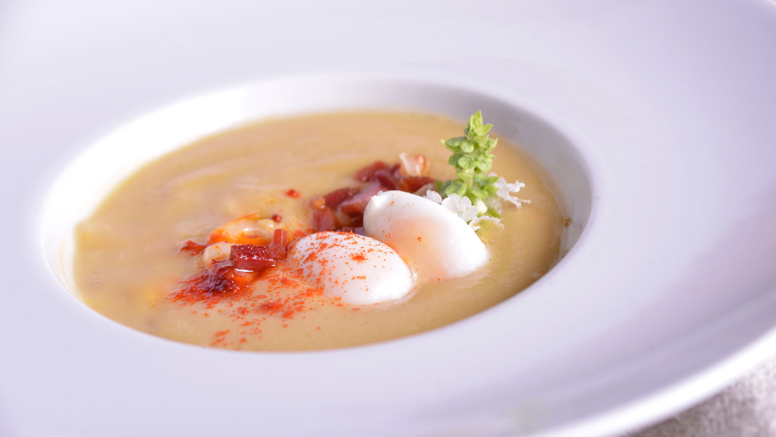 Crema de garbanzos con garbanzos fritos y huevos de codorniz