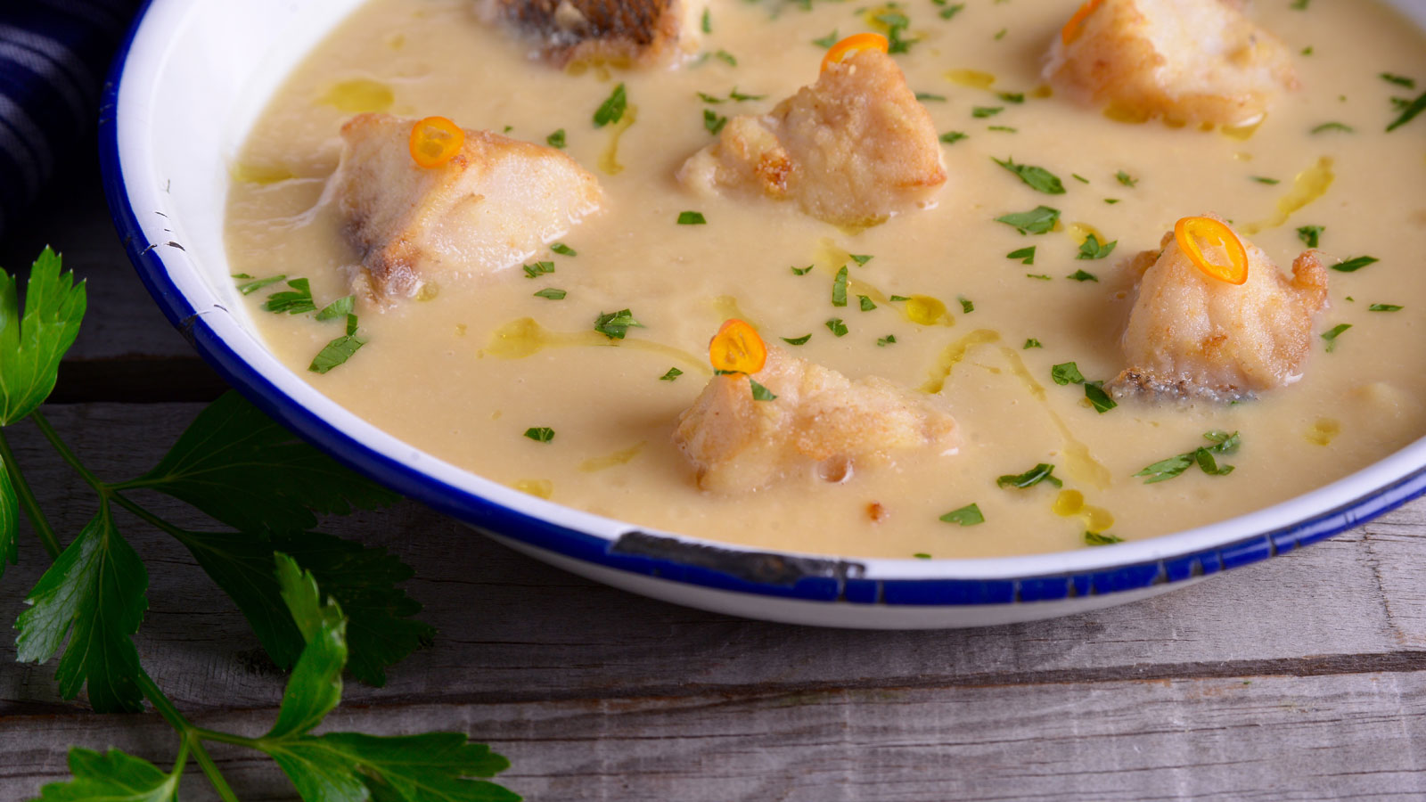 Para el emplatado, colocamos primero la crema de garbanzos y por encima ponemos el mero frito. Por último, echamos un chorro de limón, aceite, el perejil y el chile picado.