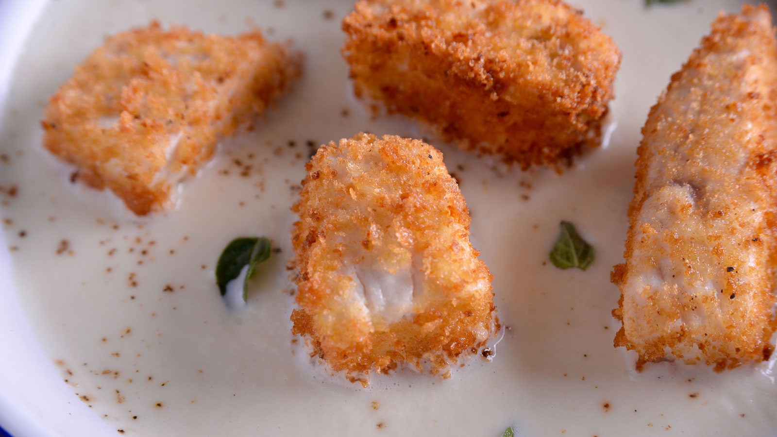 Crema de hinojo con tacos de pez espada fritos en pan rallado y orégano fresco