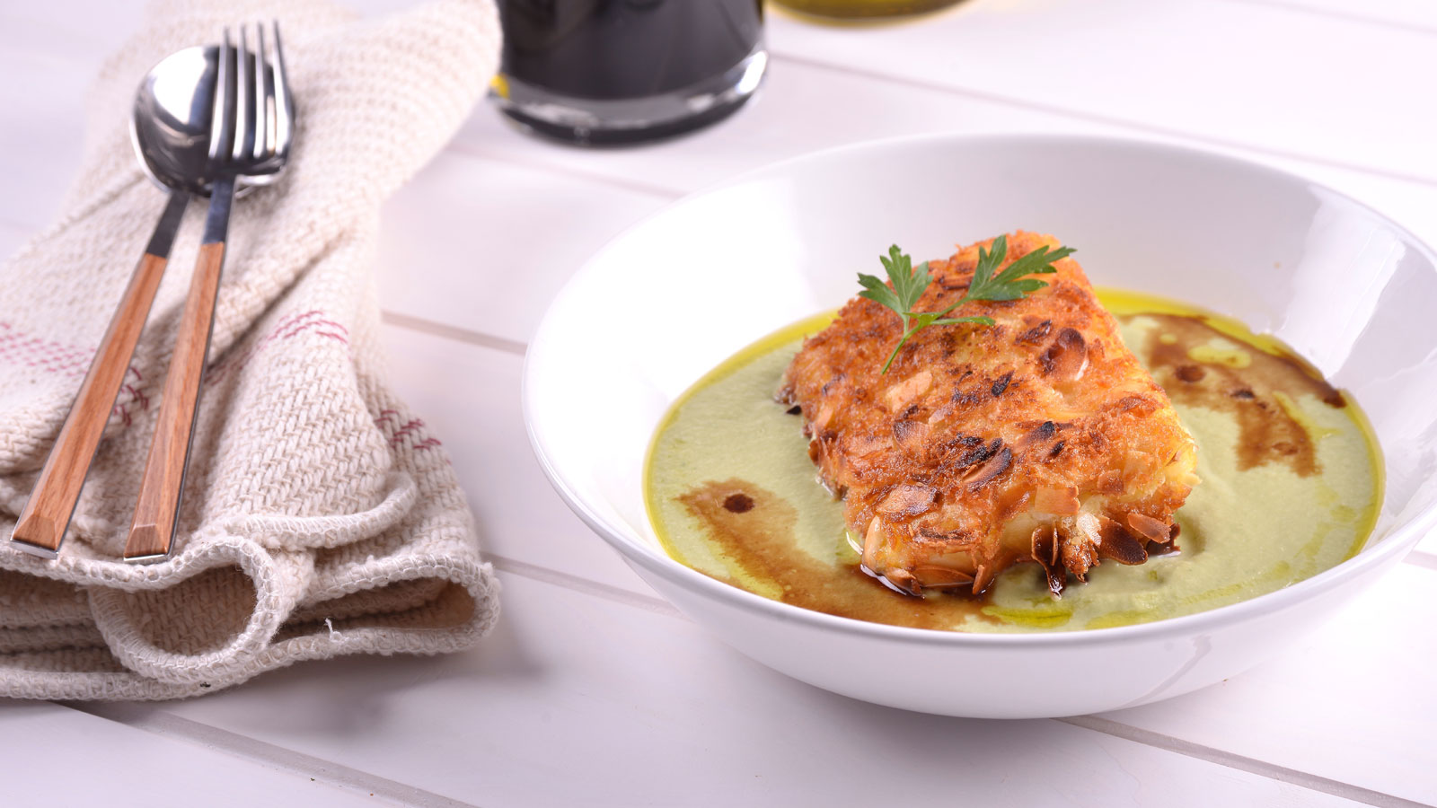Para finalizar, vertemos en un plato hondo crema de pepino y aguacates. Encima colocamos la pieza de bacalao rebozada y decoramos con un poco de perejil fresco.