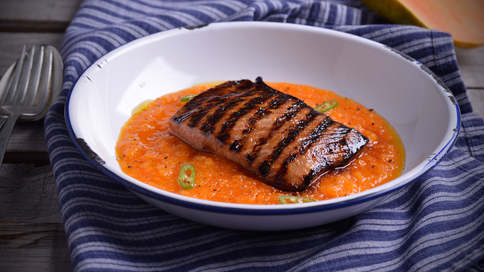 Crema de zanahoria, calabaza y papaya con presa ibérica especiada a la parrilla