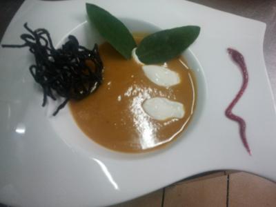 Por ultimo, ponemos la crema en un cuenco, lo decoramos con el yogurt restante, unas hojitas de savia y encima los fideos